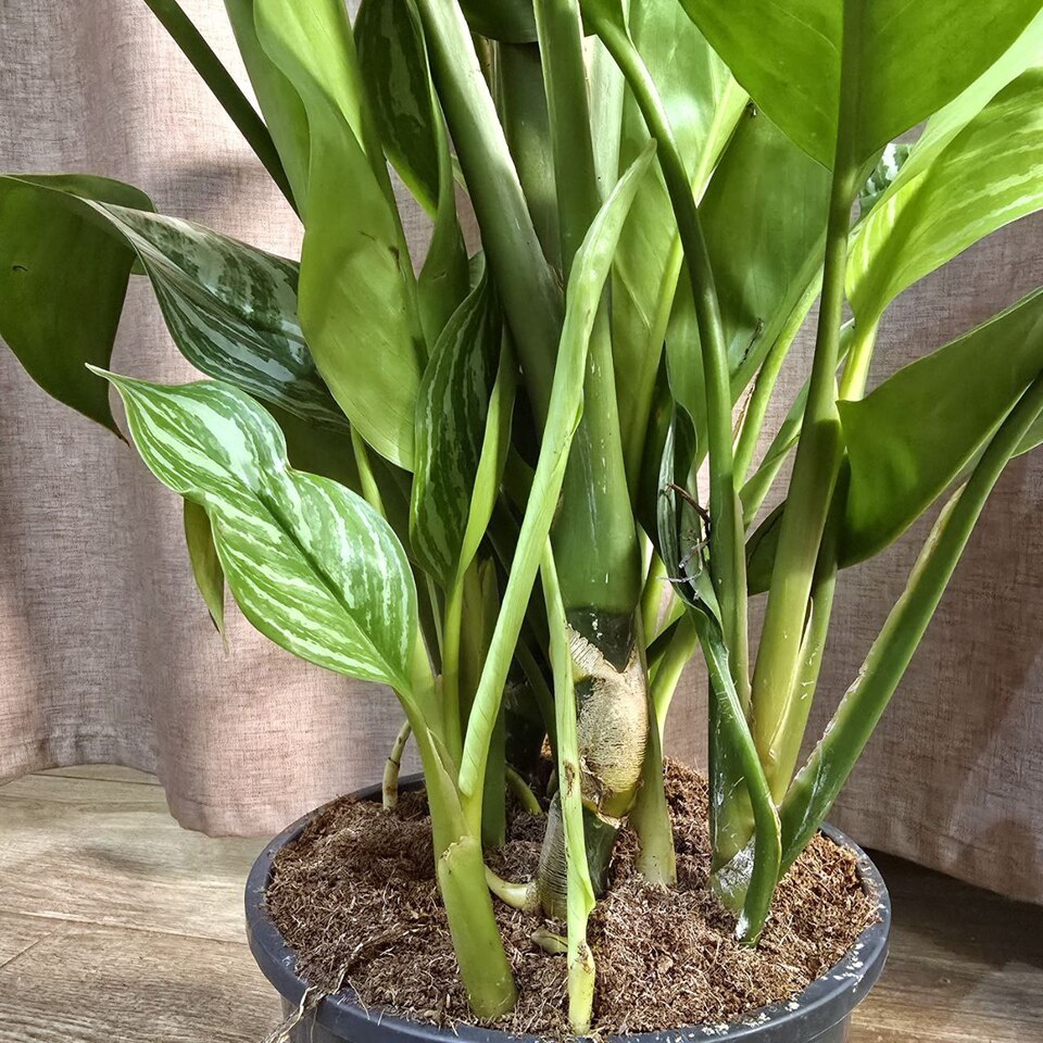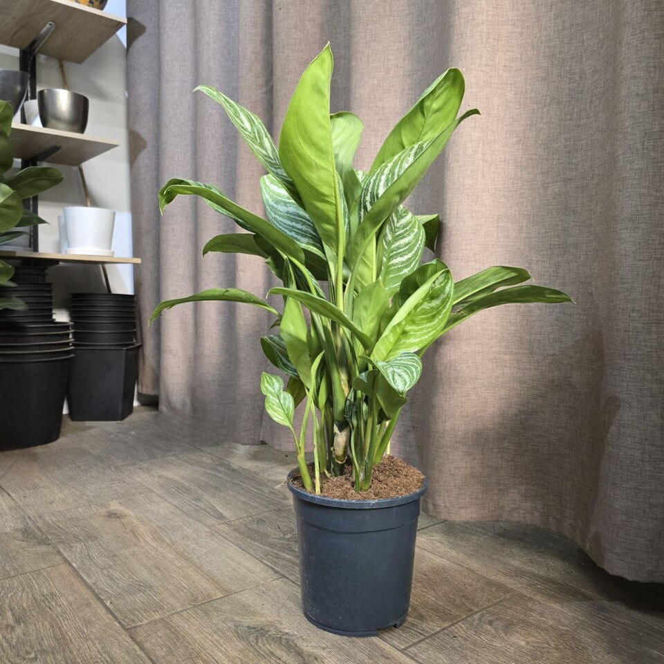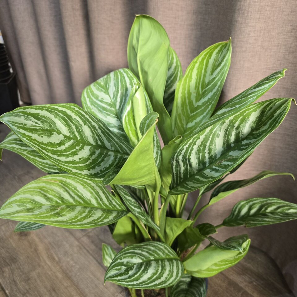 Аглаонема Страйпс обладает пышной ,листовой массой редкой расцветки в виде полос, идущих от центральной жилки к краю листа. Неприхотлива.