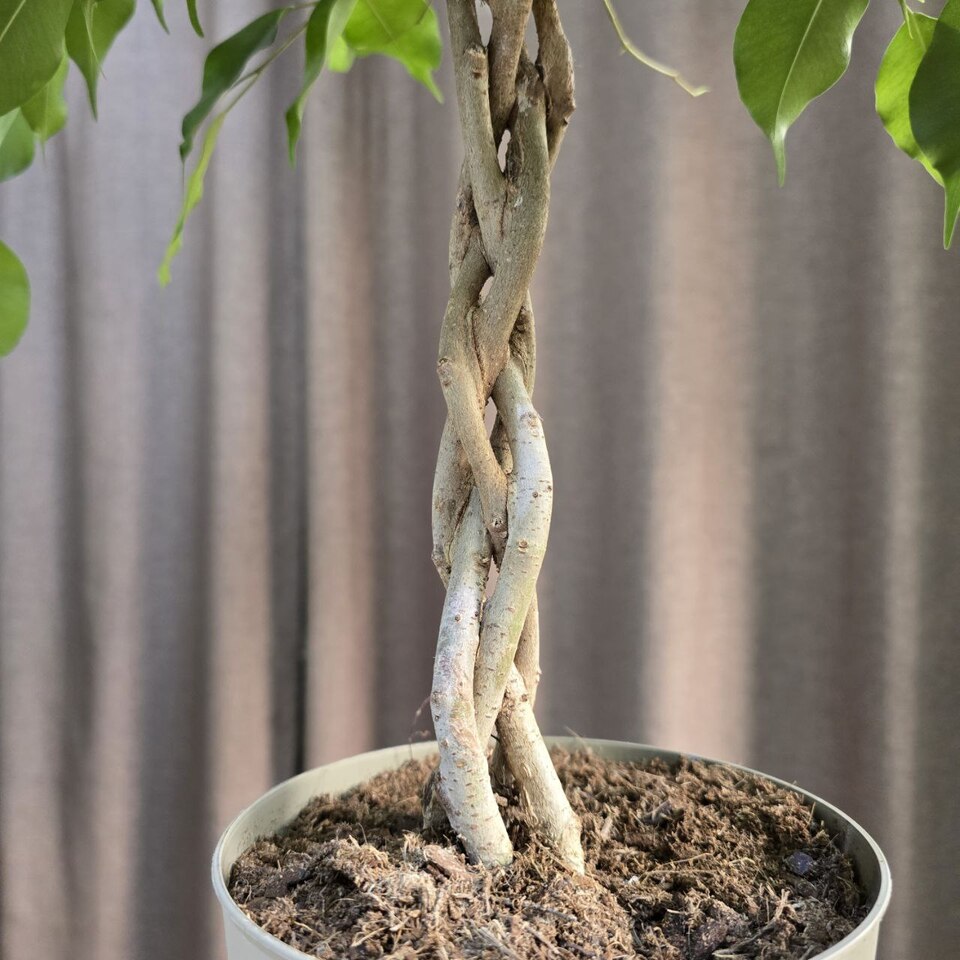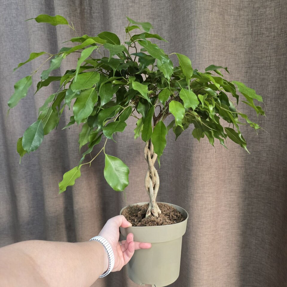 Фикус Бенджамина Банди-редкое деревце с пышной кроной на переплетенном стволе. Предпочитает яркое, рассеянное освещение, избегая прямых солнечных лучей.🪴Высота 60см/ Диаметр 17 см. 💡Свет: яркий/рассеянный 💧Полив: умеренный+ опрыскивание