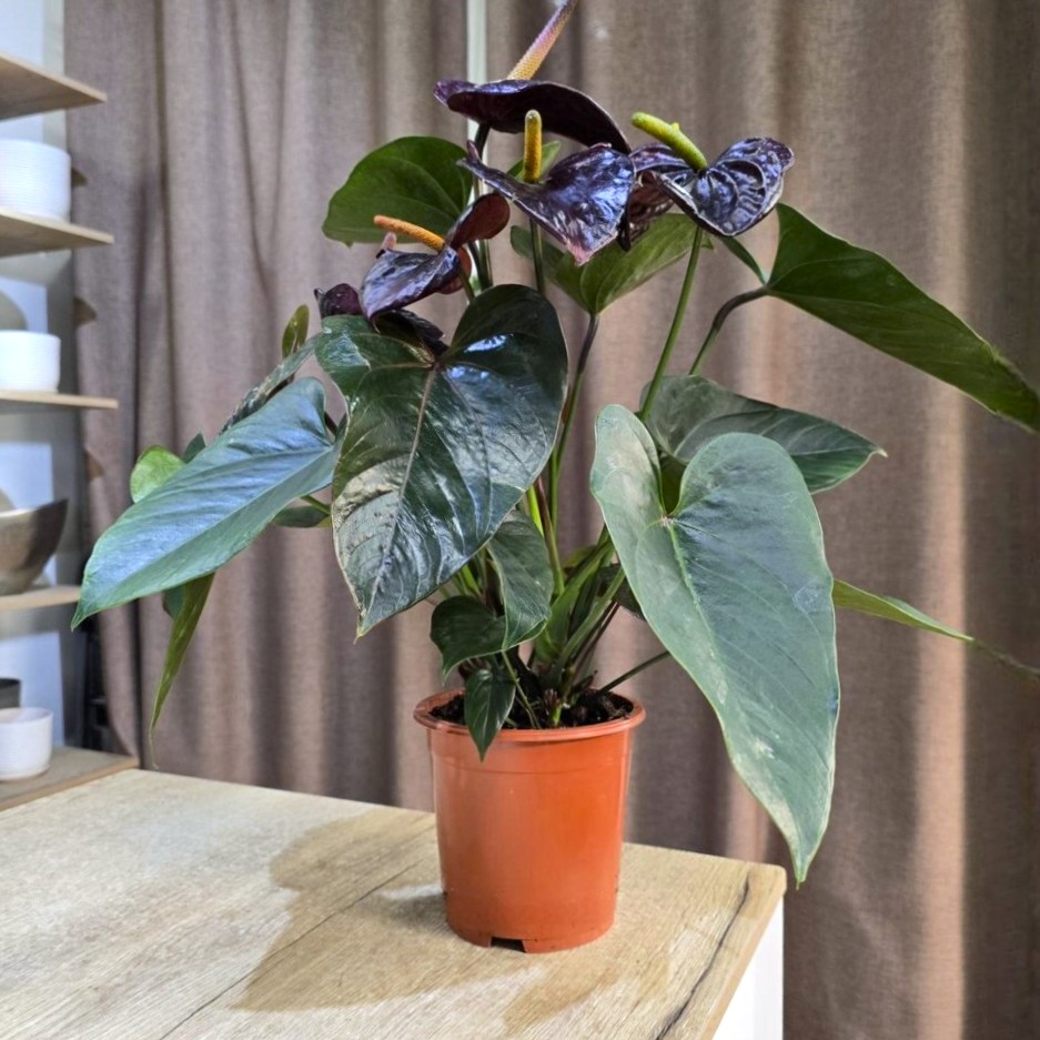 Антуриум Джамбо Блэк-экзотическая красота в темном обличье. Глянцевые, сердцевидные листья создают завораживающий контраст с изящным початком черного цвета. Высота 65см/диаметр 17см