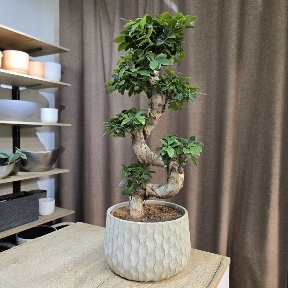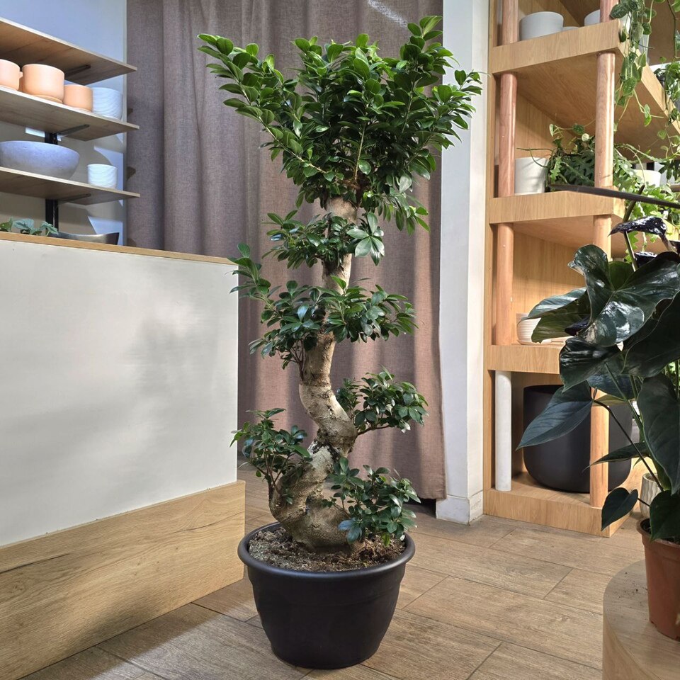 Роскошный живой Фикус Гинсенг Бонсай- один из самых узнаваемых, необычных и изящных сортов фикуса. Пышная крона, побеги красиво и густо ветвятся, массивный ствол интересной формы✨•Высота растения 140см/диаметр горшка 40см