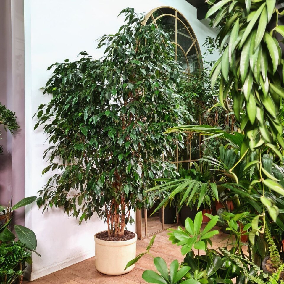 Фикус бенджамина – высокое дерево, символ уюта и долголетия. Глянцевые листья и ветвистый ствол делают его популярным выбором для оформления интерьеров.