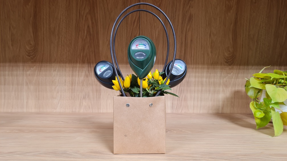 Измеритель влажности почвы . Датчик прост в использовании: достаточно вынуть пластиковый лист снизу и опустить устройство в почву. Он издает звуковой сигнал, когда в почве недостаточно воды, напоминая о необходимости полива. Работает на стандартных батарейках, которых хватает примерно на год. Устройство также создает приятную атмосферу, издавая звуки птиц или лягушек во время работы. Этот датчик помогает избежать ошибок при поливе растений, делая уход за садом проще и приятнее.