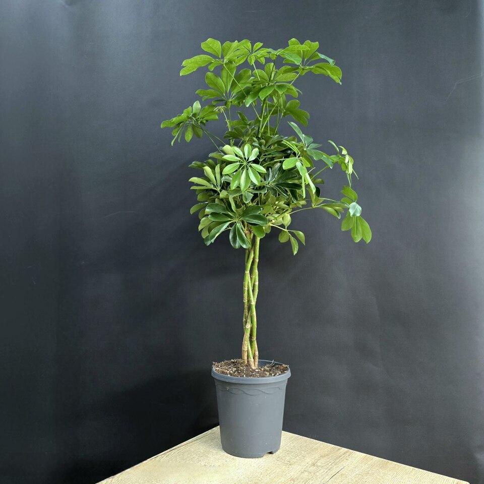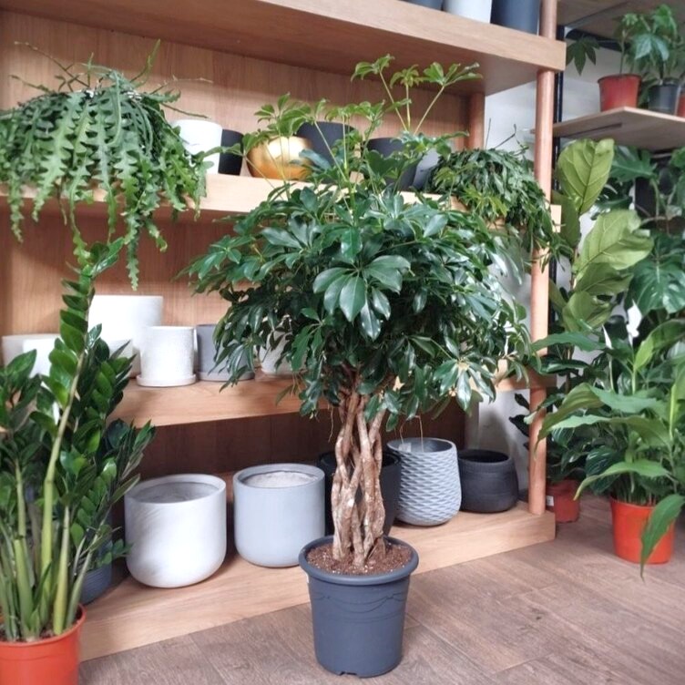 Шеффлера компакта. Стволы переплетены между собой в стройную косу. Яркое деревце с пышной кроной ,обладает способностью очищать воздух в помещении.🪴Высота 130см/ Диаметр 30 см.