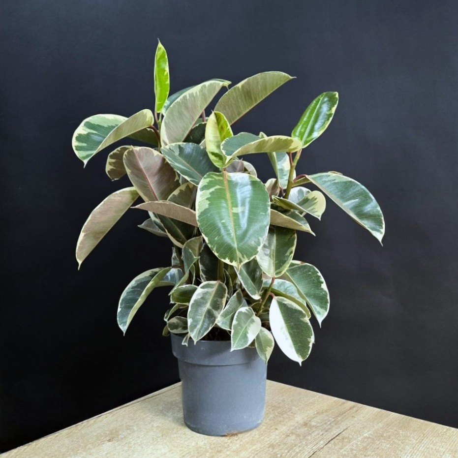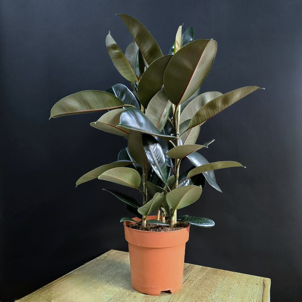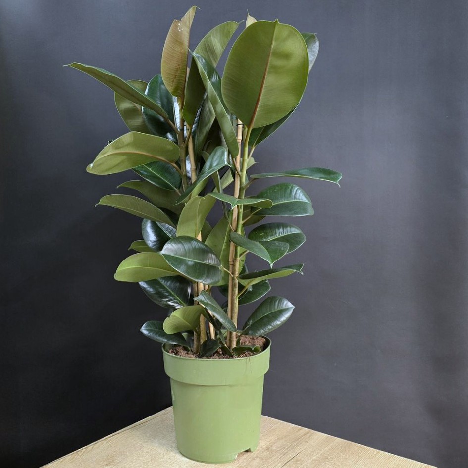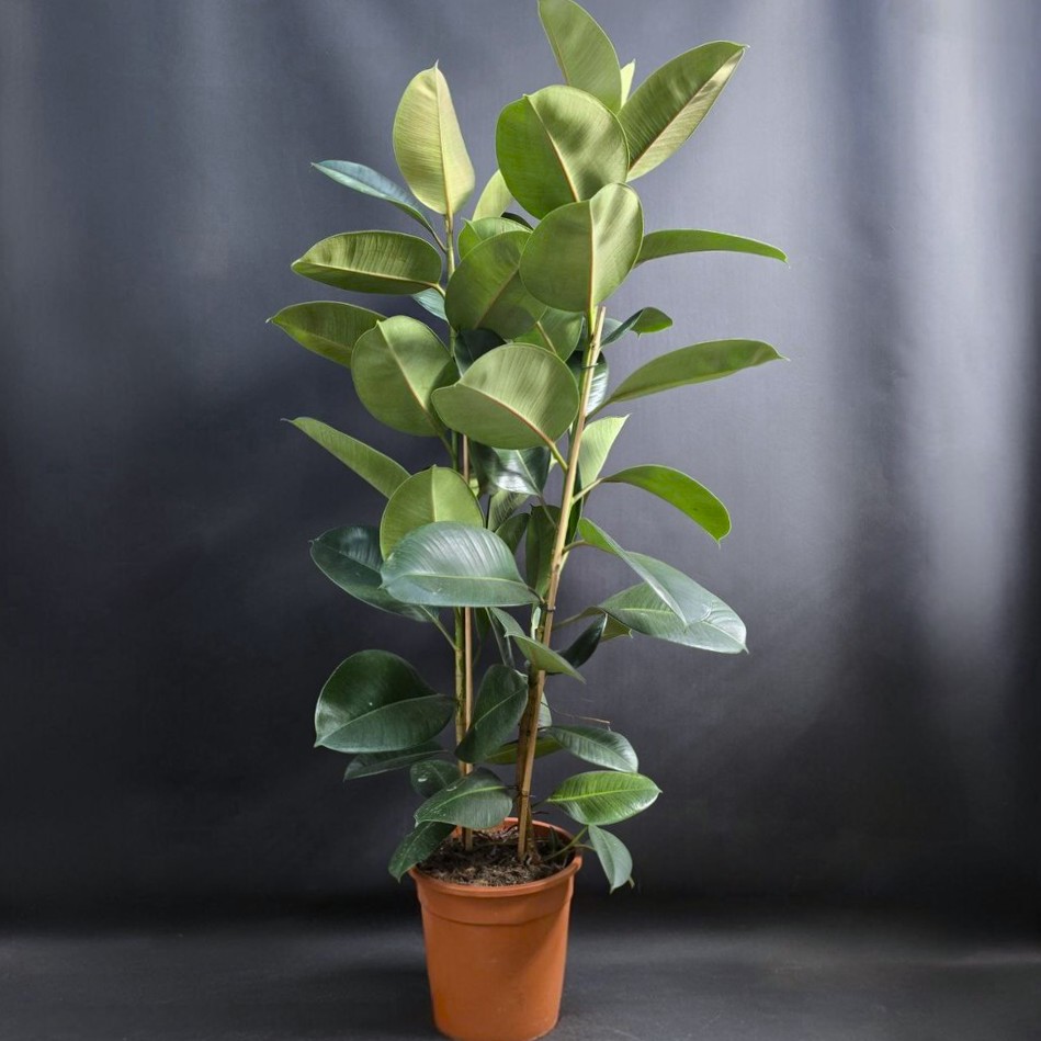 Фикус Эластика Тинеке клумба. Блестящие листья с уникальными узорами от глубокого зеленого до нежного кремового оттенка, каждый ствол дополняет создавая эффект объемности и грации.🪴Высота 80см/ Диаметр 21см.